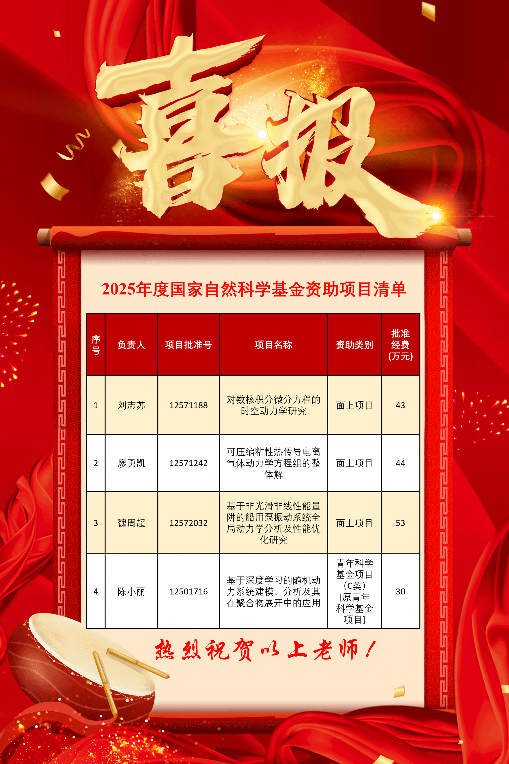 2025年8月27日,国家自然科学基金委员会公布了2025年集中接收期项目评审结果,我院共有4项项目获得立项资助,其中面上项目3项、青年科学基金项目(C类)[原青年科学基金项目] 1项。