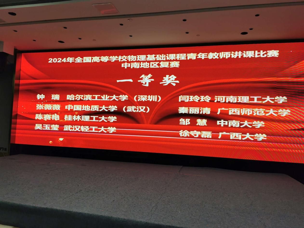 2024年全国高等学校物理基础课程青年教师讲课比赛中南地区复赛于6月21日-23日在河南洛阳成功举办,我院张薇薇教师参赛并获得一等奖。
